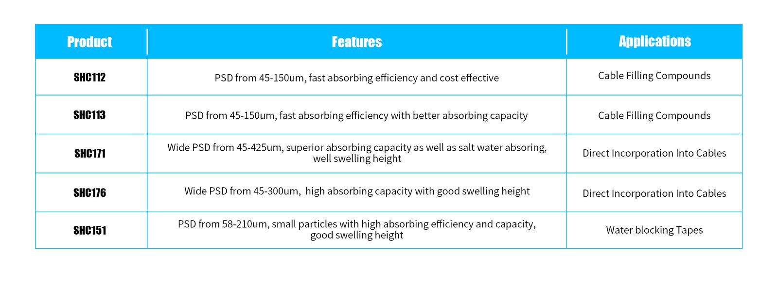 Designed for high-voltage, communication, and fiber optic cables underground, we offers a wide range of water-swellable, water-absorbing and water-blocking polymers(SAP), offering reliable, cost-effective solutions to enhance cable durability and performance, meeting the growing demand for high-performance cables across industries.